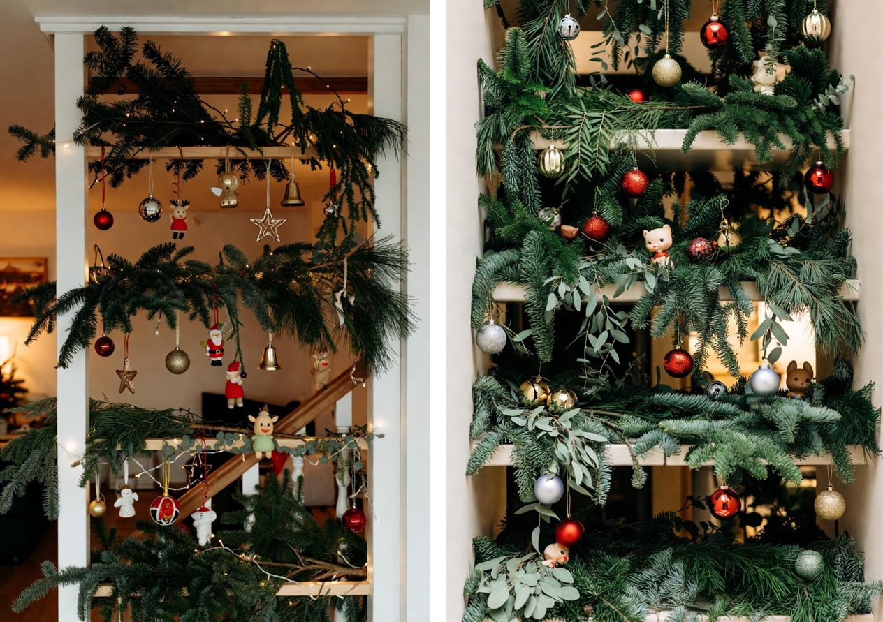 Если в доме есть лестница, можно украсить перила и открытые стеллажи/полки веточками хвои сосны/ели, эвкалипта, туи или другими зелеными растениями. Дополнить эту композицию можно елочными игрушками или милыми фигурками.