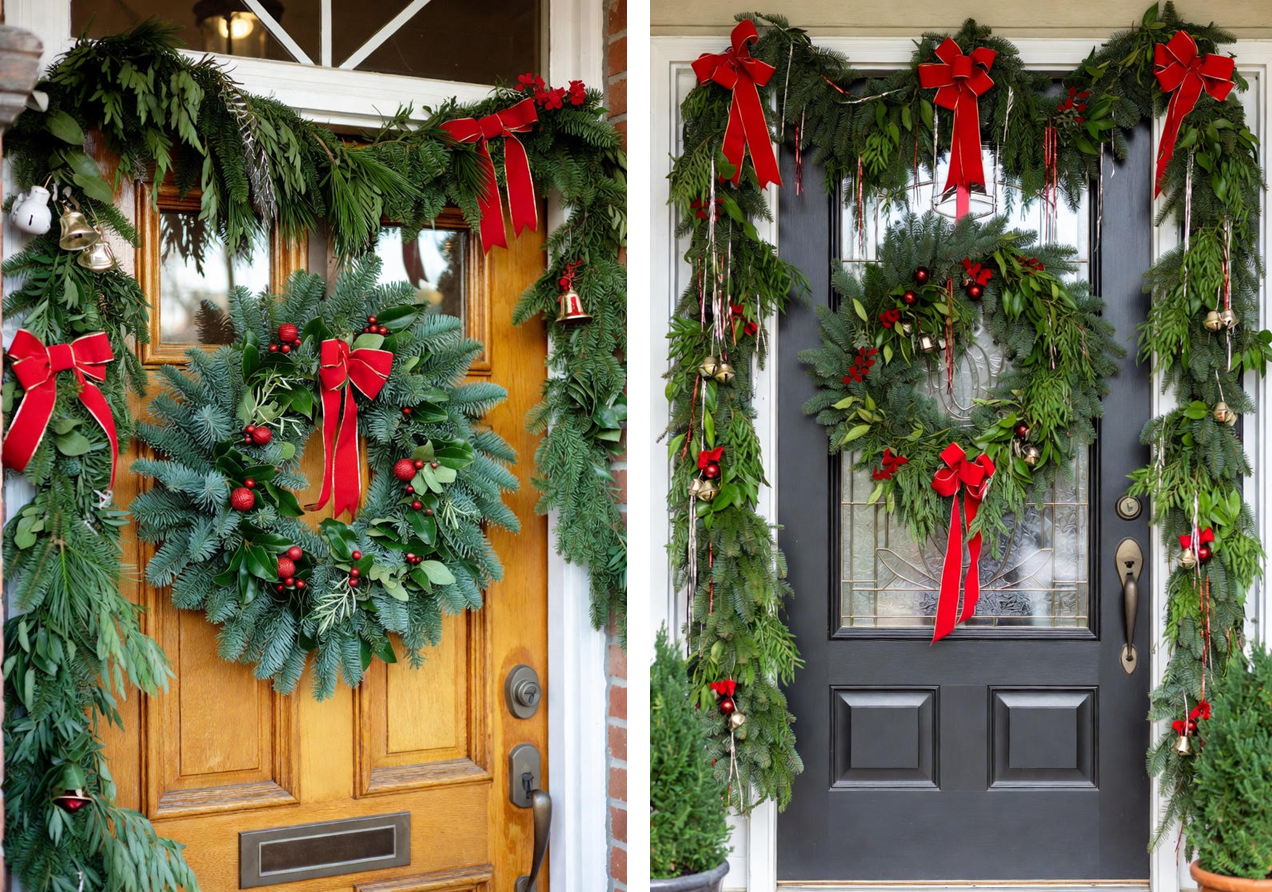 Повесьте на входную дверь красивый рождественский венок. Его можно сделать своими руками или же купить готовый. Также можно сделать хвойное обрамление всего дверного проема в доме. Для этого можно использовать, как живую, так и искусственную хвою. А завершить композицию можно красными лентами, бантами, колокольчиками или "дождиком".