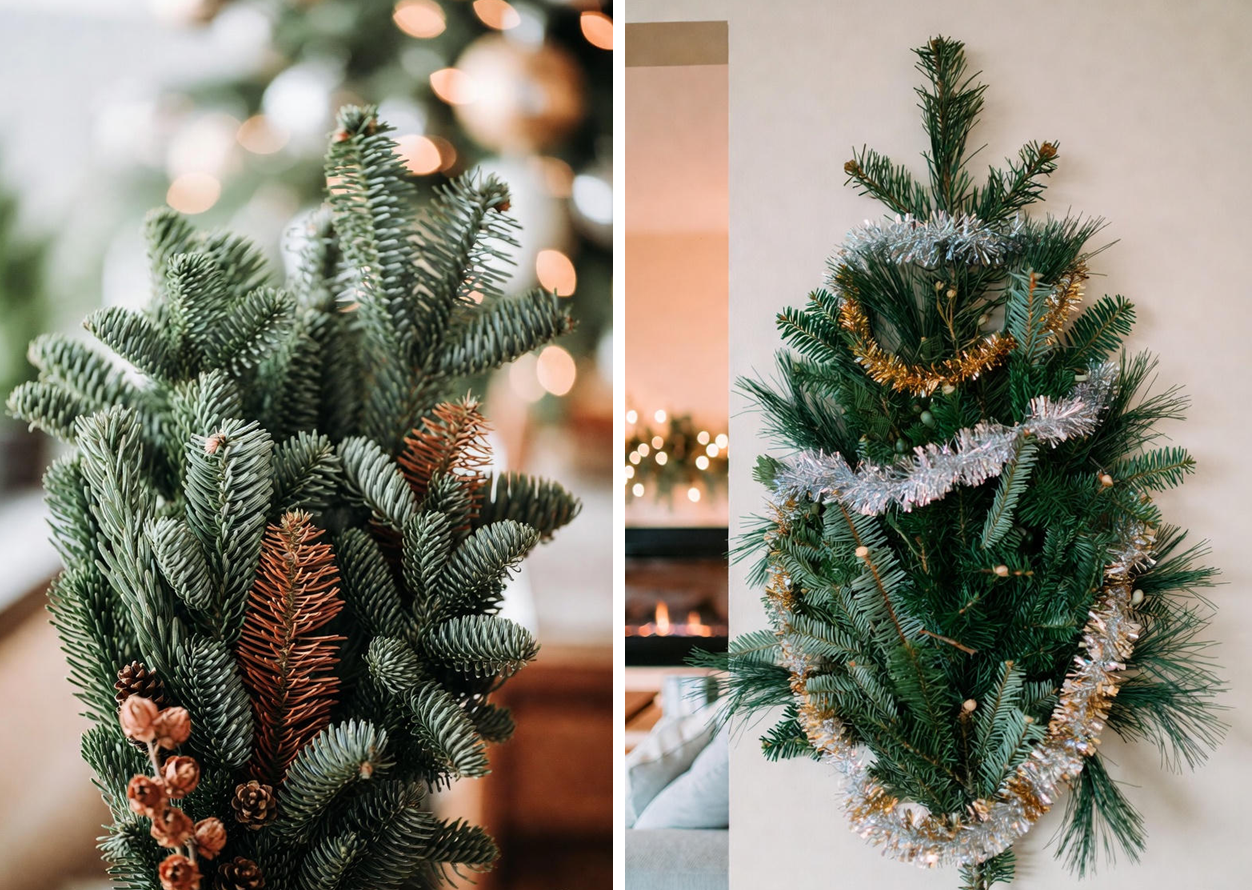 Если не хотите ставить большое дерево, то сделайте красивую композицию из веток хвои, обмотанных гирляндой, и прикрепите на стену. Также можно собрать красивый "букет" из веток ели, сосны и других вечнозеленых деревьев и поставить их в вазу, украсив новогодней мишурой.