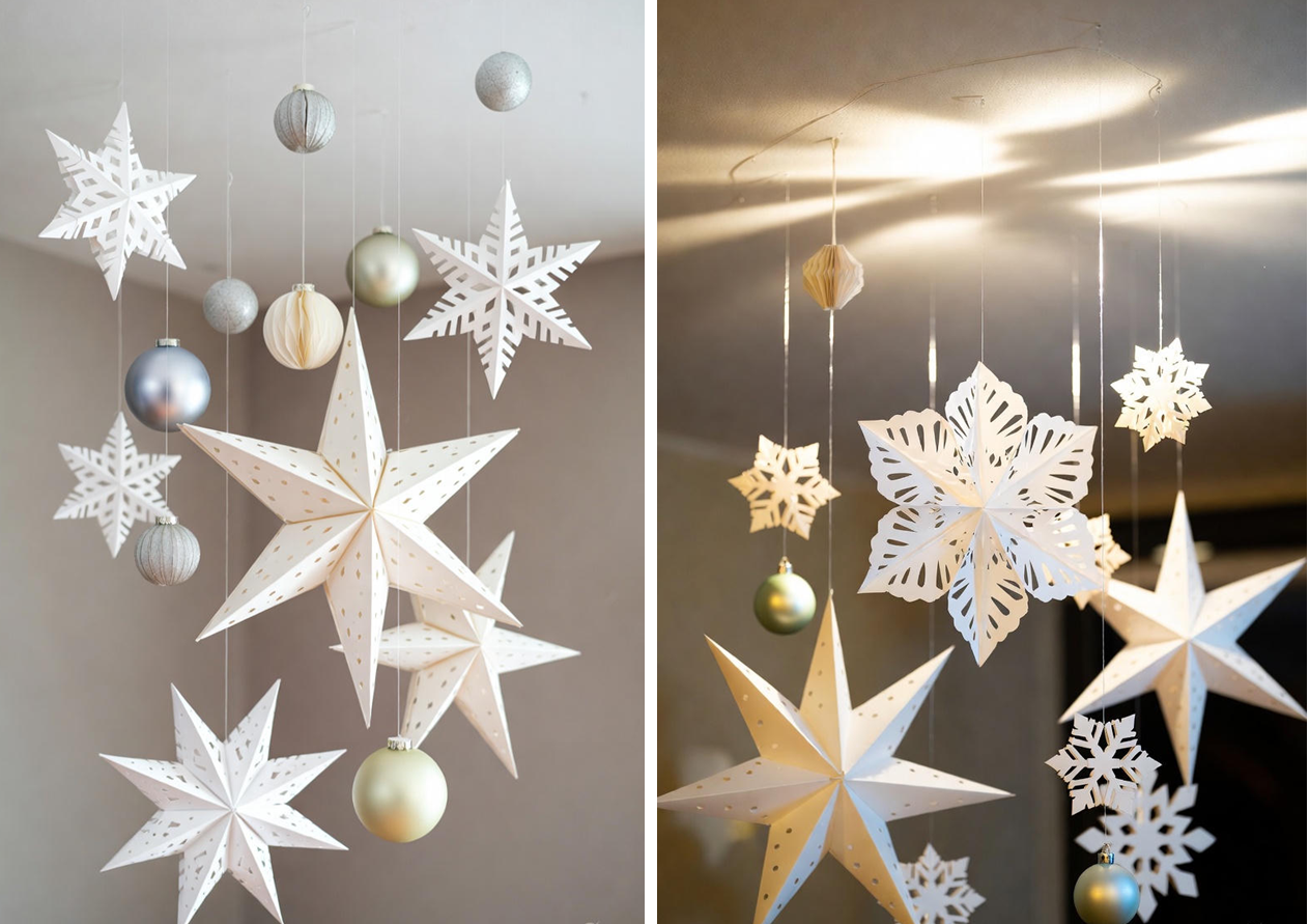 Для украшения дома можно использовать пространство под потолком. С помощью тонкой лески подвесьте бумажные звезды, крупные снежинки или легкие елочные шары на разной высоте.