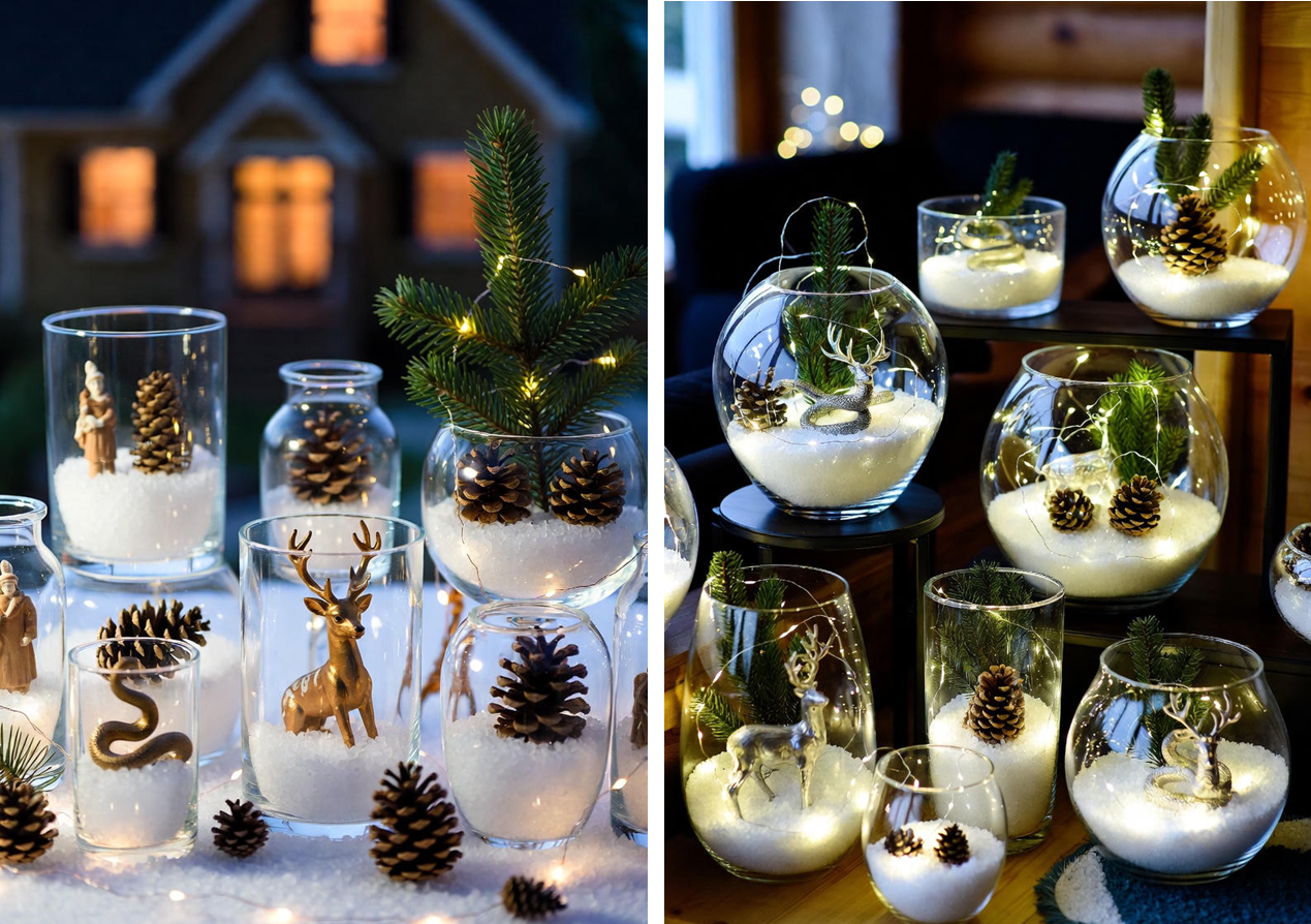 Возьмите большие прозрачные вазы или банки. Насыпьте на дно искусственный снег (или крупную морскую соль), поставьте фигурку оленя или змеи, добавьте пару шишек и маленькую веточку ели. Добавьте внутрь гирлянду на батарейках, чтобы композиция светилась изнутри. Расставьте эти вазы и банки по дому и наслаждайтесь праздничной атмосферой.
