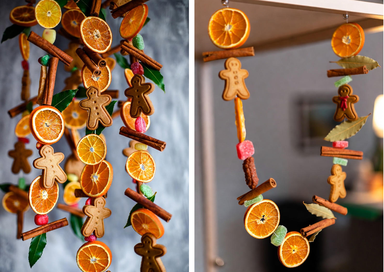 Для украшения пространства в доме можно сделать съедобные гирлянды. Для этого используйте сушеные колечки апельсина, палочки корицы, имбирные пряники, конфеты и лавровые листья. Это не только красиво, но и наполняет дом потрясающим ароматом.