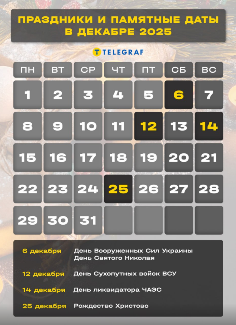 Верующие Католической церкви, протестантских конфессий (баптисты, пятидесятники, лютеране, реформаты и другие), а также Православная церковь Украины (ПЦУ) и Украинская греко-католическая церковь (УГКЦ), которые перешли на новоюлианский календарь в 2023 году, будут праздновать Рождество в четверг, 25 декабря. Новый год украинцы будут встречать в ночь с 31 декабря на 1 января. Сам день 1 января 2026 также приходится на четверг. В мирный период это был официальный выходной, однако во время войны он считается обычным рабочим днем для предприятий, бюджетных учреждений и организаций.
