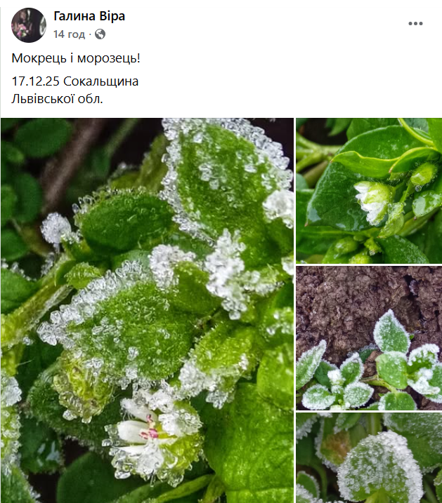 Так, пользовательница Галина Вера показала, что у нее на Львовщине цветет в морозы звездочник средний, или мокрец, как его называют в народе. На фото видно, что растение буквально покрыто инеем, но продолжает зеленеть.