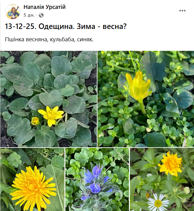 На Одесчине в декабре зацвели лютик-пшинка, одуванчики и синяк обычный. Фото в сообществе показала Наталья Урсатий.