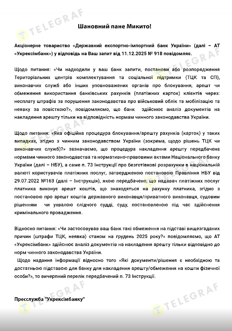 "Телеграф" получил официальный ответ Укрэксимбанка с разъяснением механизма блокировки средств и правовых оснований таких решений.