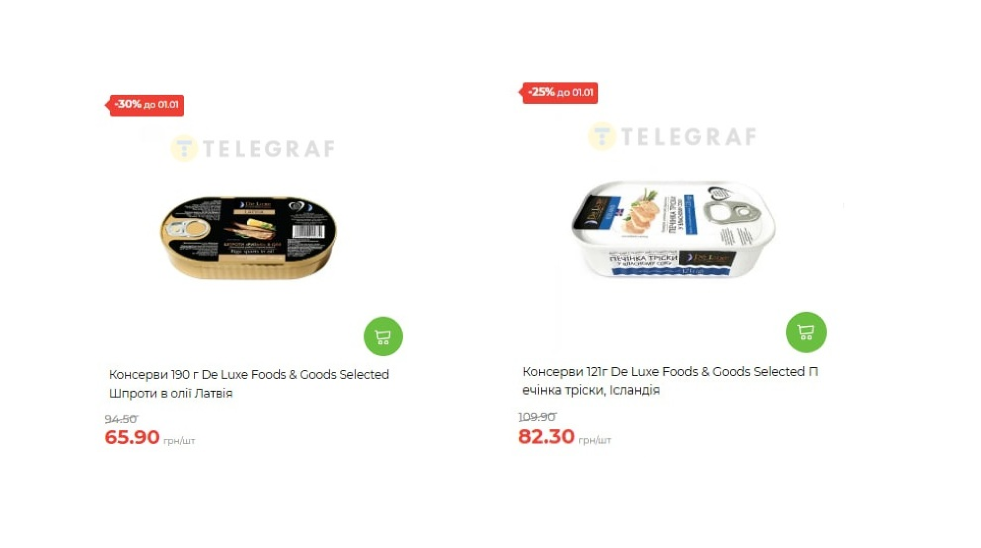 Отдельно действует скидка на печень трески De Luxe Foods & Goods Selected весом 121 грамм. Ее продают за 82,30 гривны вместо 109,90 гривен.