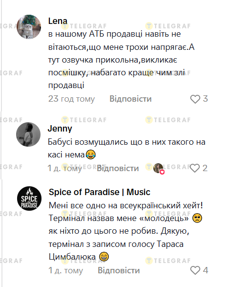 Часть украинцев, особенно любители творчества актера рады нововведению. В основном, потому что не хватает похвалы или дружелюбия. "Мне все равно на всеукраинский хейт! Терминал назвал меня "молодец" как никто до этого не делал. Спасибо, терминал с записью голоса Тараса Цымбалюка", "В нашем АТБ продавцы даже не здороваются, что меня немного напрягает. А здесь озвучка прикольная, вызывает улыбку, намного лучше, чем злые продавцы", "Бабушки возмущались, что у них такого на кассе нет" — пишут в комментариях.
