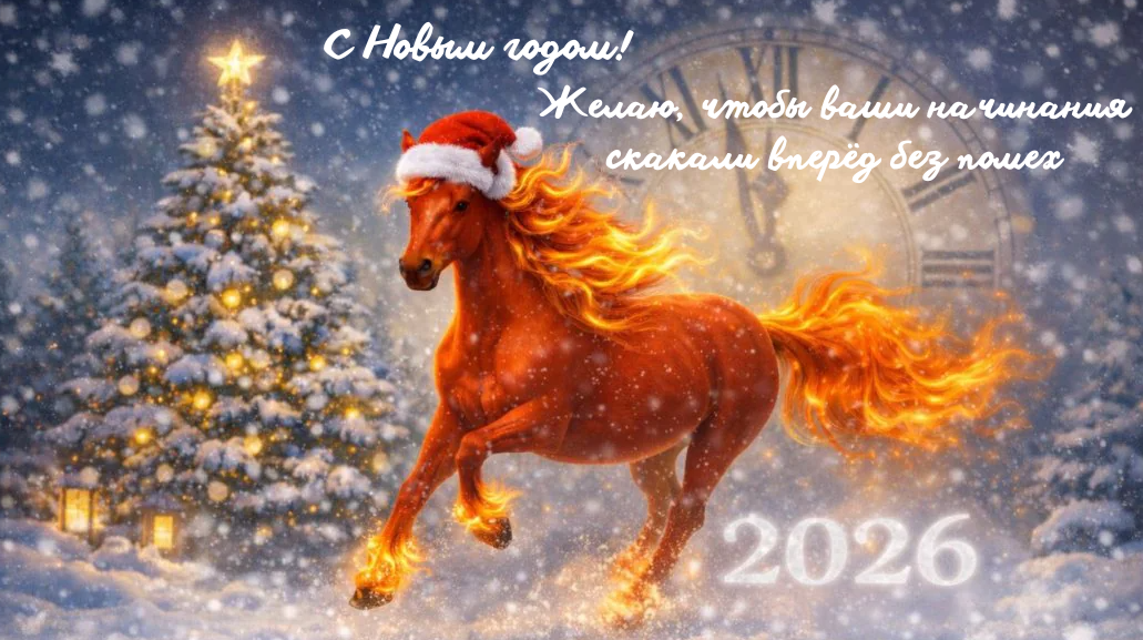 С Новым годом! В 2026 желаю вам не пахать как лошадь, а выбирать умный темп, ловить удачные моменты и уверенно выходить вперед. Пусть энергия года помогает легко добиваться желаемого, а жизнь радует приятными поворотами и щедрыми наградами.