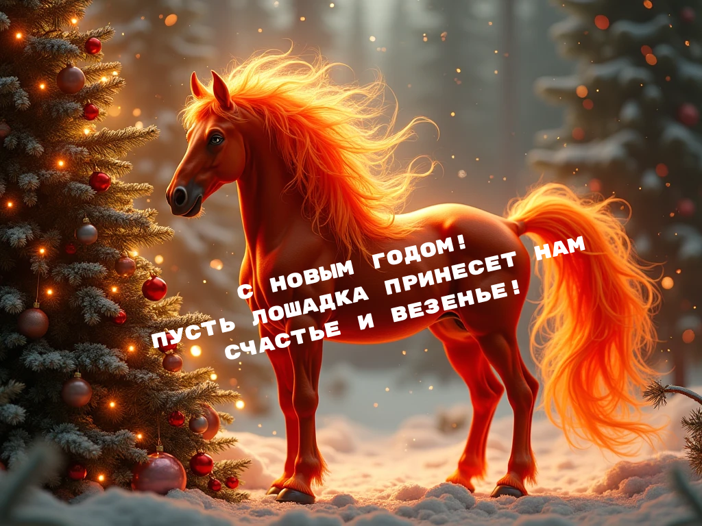 С Новым годом Пусть в этом году Лошадь мчит вас в счастье на всех парах — галопом, без пробуксовки, и с попутным ветром. Пусть хвост стоит трубой, грива развевается на ветру, а настроение скачет только вверх. Не буксуйте на месте — пусть все в жизни несется легко и весело!