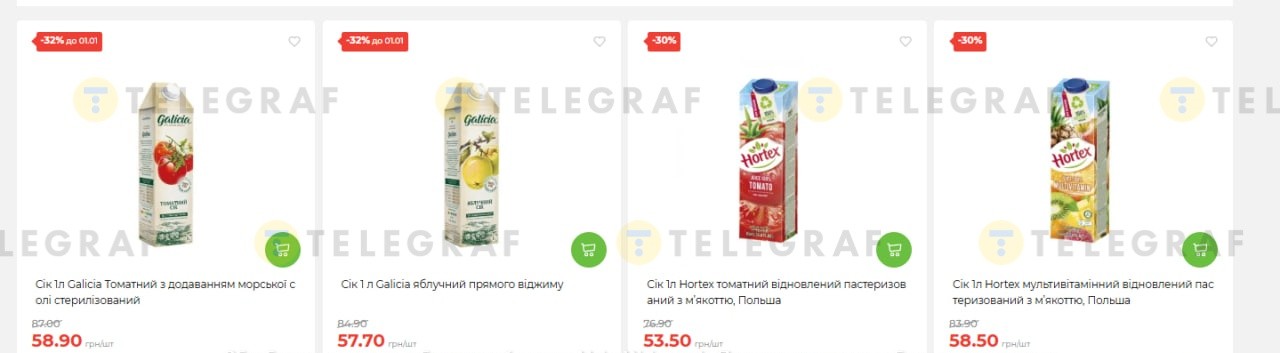 Также в продаже есть соки "Galicia". Томатный сок стоит 58,90 гривны, а яблочный — 57,70 гривны, хотя раньше их цена была почти 90 гривен.