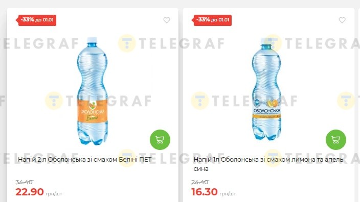 В частности, напитки "Оболонская" 2 литра со вкусами Белини и лимон с апельсином продают за 22,90 гривны и 16,30 гривны соответственно. На эти позиции действует скидка 33%.