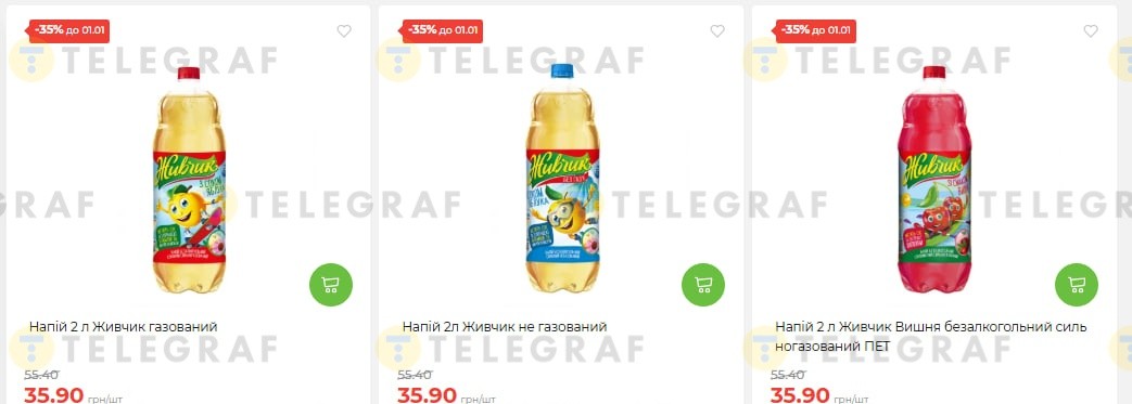 Среди газированных напитков действует акция на "Живчик" 2 литра. Покупатели могут сэкономить около 20 гривен на бутылке, ведь скидка на нее -35%.
