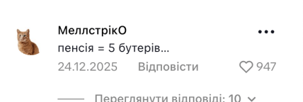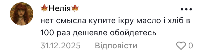 В комментариях пользователи были удивлены ценой бутерброда. Некоторые даже подсчитали, что 5 таких бутербродов с икрой — это одна минимальная пенсия, которая в 2026 году составляет почти 3000 грн. Люди писали: