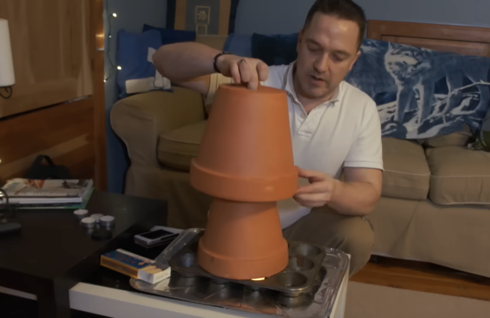 По словам иностранца, чтобы обогреть комнату таким способом, нужно взять несколько свечей и два горшка. Зажженные свечи ставим на огнеупорную поверхность, можно использовать кирпич или металлическую подставку. Эту конструкцию накрываем горшками, желательно, чтобы они были глиняными. Сверху на горшок со свечами нужно поставить еще один горшок, как показано на видео. Таким образом образуется дополнительная прослойка для циркуляции воздуха.