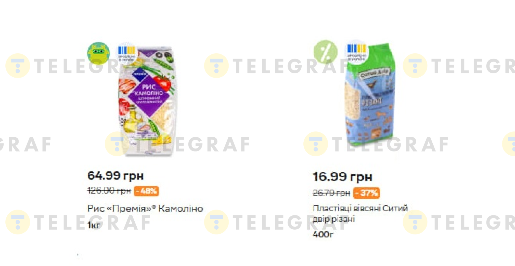 Например, рис от торговой марки "Премия" Камолино 1 кг сейчас стоит 64,99 гривны вместо 129 гривен, что на 48% дешевле. Овсяные хлопья "Сытый двор" резаные 400 грамм продают по 16,99 гривны вместо 26,79 гривны, экономия составляет 37%. Скидки на эти два товара будут действовать до 7 января.
