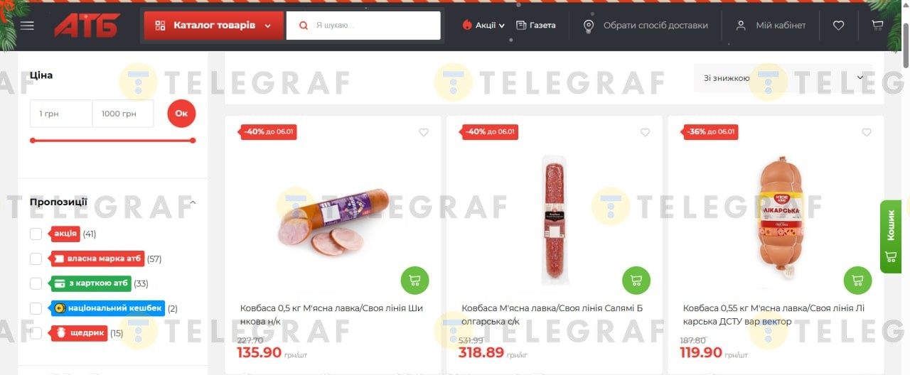 К примеру, колбаса 0,5 килограммов от ТМ "Мясная лавка/Своя линия" шинковая сейчас стоит 135,90 гривны вместо 227,70 гривны, что на 40% дешевле.