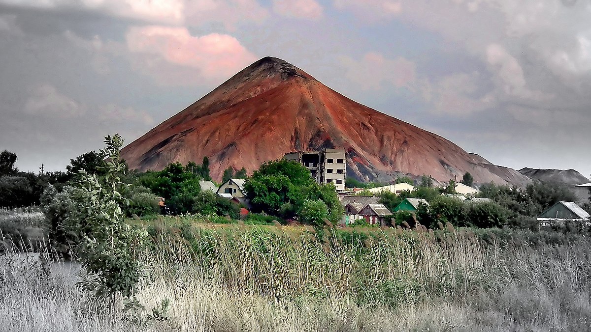 Здесь все достаточно просто, большинство терриконов имеют красный цвет. Это хорошо видно на фото. Ведь их формировали из уже сгоревшего угля, то есть жужелки. А так как большинство людей на Донбассе работали именно в угольных шахтах, появилось такое блюдо как "Терикон".