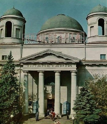 На архивном фото хорошо видно, как органично соединились две эпохи: классицистический портик с колоннами, две боковые башни с куполами и огромный центральный купол храма сохранили свой первоначальный вид, но над входом большими буквами красовалась надпись "ПЛАНЕТАРИЙ".