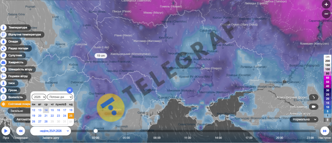 Высота снежного покрова во Львове 25 января. Скриншот из Ventusky
