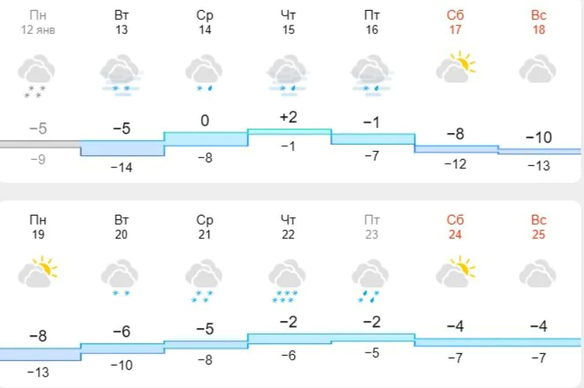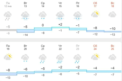Подобный прогноз дают и синоптики сервиса meteofor. По их данным, с 17 по 20 января температура в городе будет колебаться в пределах -10-13 градусов. 20 января возможен небольшой снег.