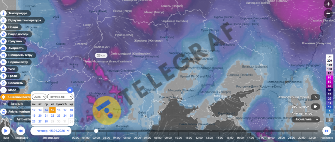 Высота снежного покрова в Львове 15 января. Скриншот из Ventusky