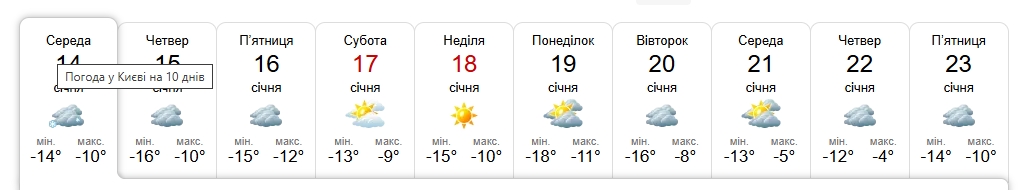 В Укргидрометцентре прогнозируют, что сильные морозы продержатся до конца января. Ночью температура воздуха местами будет опускаться до -22 градусов, а днем -12 градусов. И такие температурные показатели будут еще держаться до десяти дней.