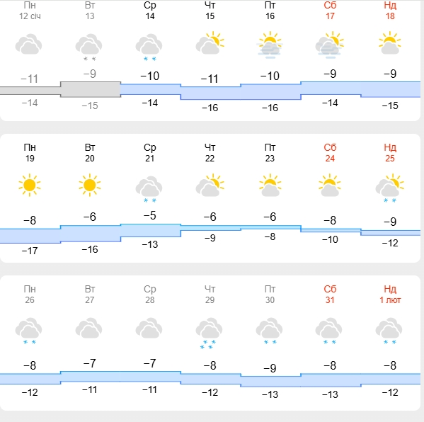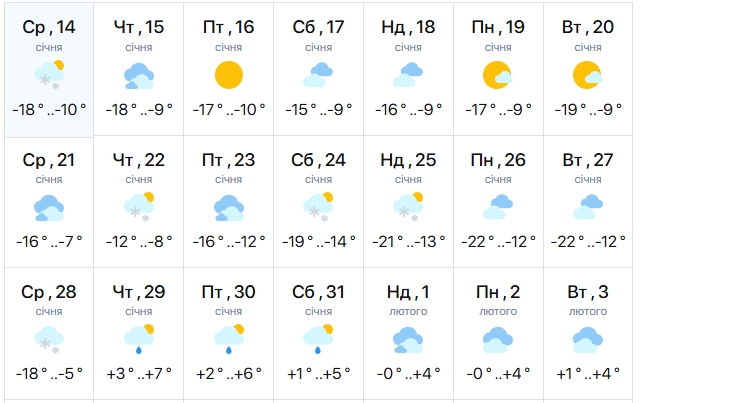 Данные сайта Meteo.ua показывают, что ближайшие дни будут морозными. Холоднее всего будет во вторник, 27 января, ночью — 22 градуса, днем -12 градусов. А к концу месяца температура вырастет до +6 градусов днем и +2 градусов ночью. Ожидаются кратковременные осадки в виде мокрого снега.