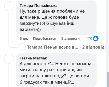 Видео быстро распространилось по сети и вызвало бурное обсуждение. Многие пишет, что есть более простое решение — нагреть воды на туристической плитке, работающей от маленьких газовых баллонов, и помыть голову. Однако им резонно отвечают – потом придется ходить по холодной квартире с мокрой головой, рискуя заболеть. Некоторые также напомнили, что существует сухой шампунь.