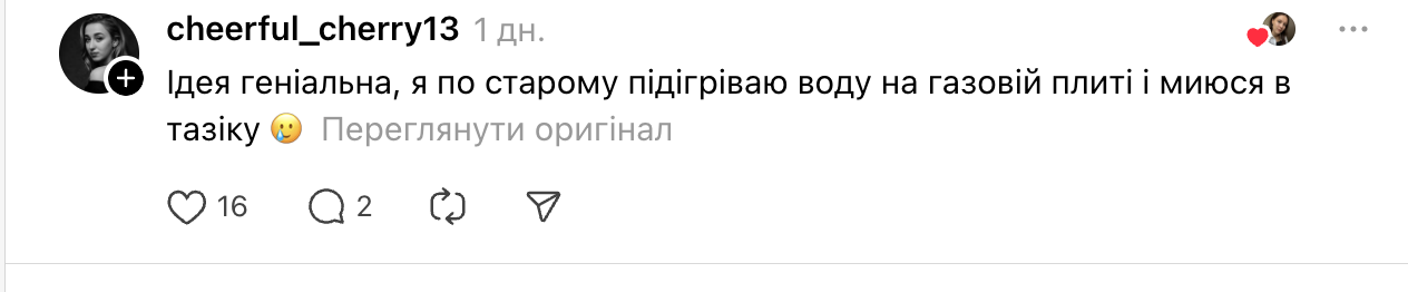 - Идея гениальная, я по старинке подогреваю воду на газовой плите и мою в тазике.