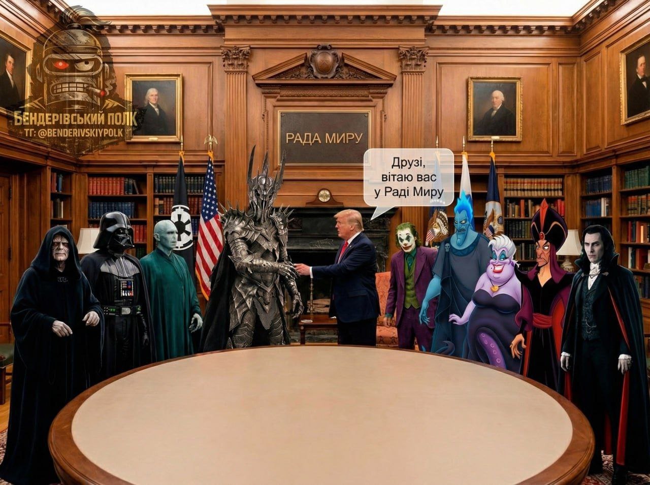 В сети публикуют шутки, как действительно выглядит Совет мира, который, к слову, Трамп хочет возглавлять пожизненно. На одной из иллюстраций члены нового органа представлены как злодеи из известных американских фильмов и мультфильмов.