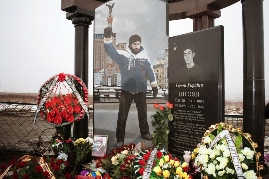 В его честь возвели масштабный мемориальный комплекс с колоннами. В центре установлен памятник с полноразмерным изображением Нигояна по фотографии, сделанной на Майдане.