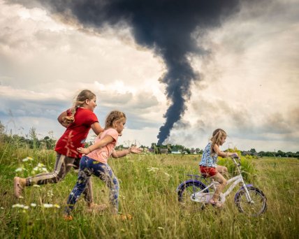 На фото — три девочки прямо среди поля. Все выглядит привычно, даже беззаботно, если бы не задний план: сзади поднимается дым от горящего после ночной атаки российского дрона нефтехранилища в Ровенской области. Контраст между невинностью детской игры и жестокой реальностью войны стал ключом к победе фотографии.