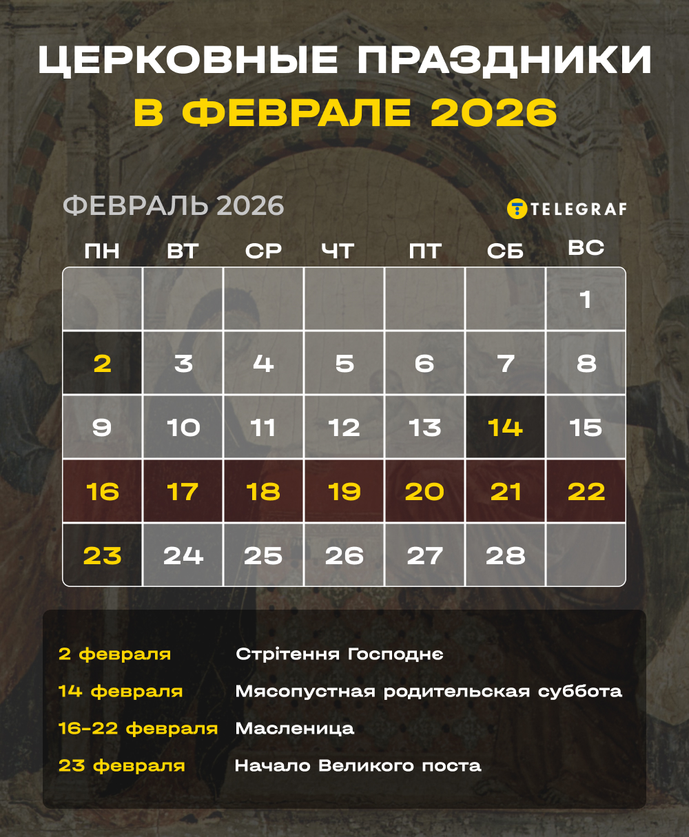 В 2023 году Православная церковь Украины (ПЦУ) перешла на новоюлинаский календарь, поэтому даты праздников сменились на 13 дней назад. "Телеграф" представляет церковный календарь на февраль, чтобы вы не пропустили главные события этого месяца.