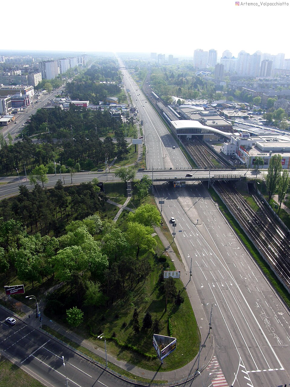 Почти вдоль всего проспекта проходит открытый участок Святошинско-Броварской линии метро. Рядом с путями тянется зеленая зона, поэтому жилая застройка начинается только в районе поселка Быковня.