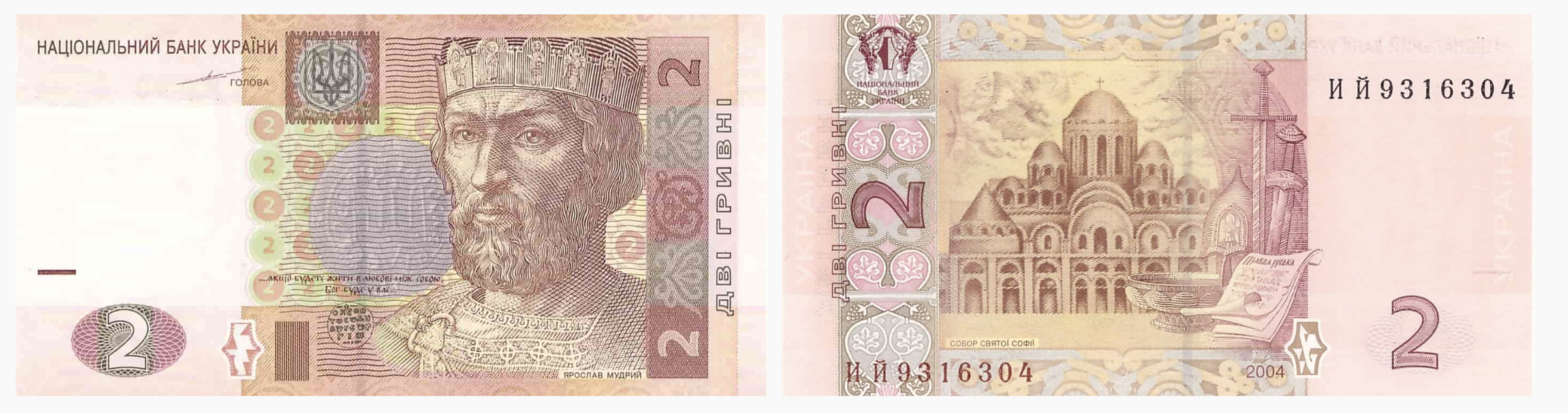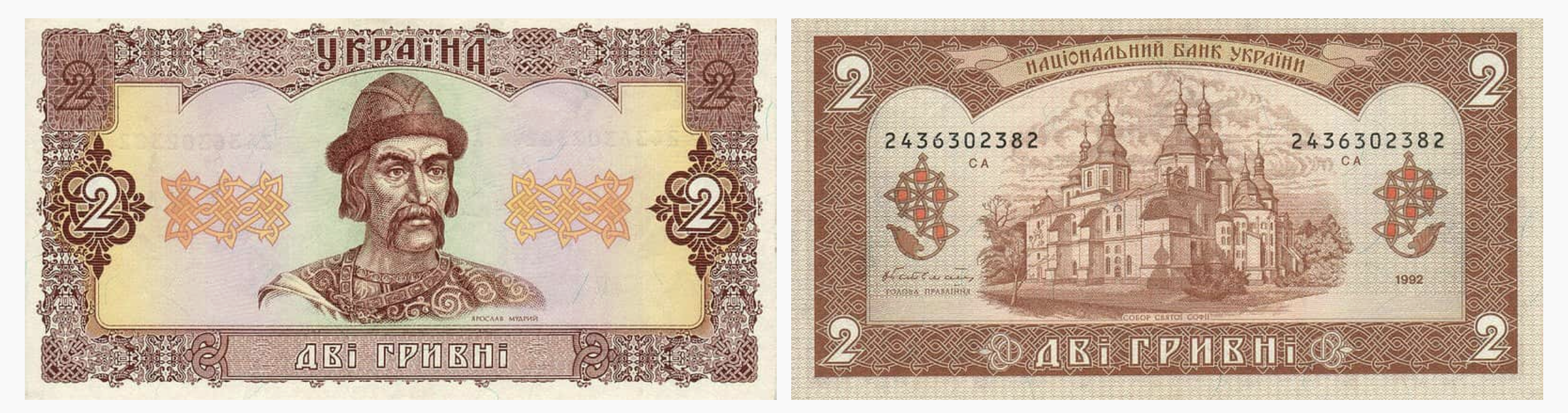 На первых банкнотах был запечатлен портрет великого киевского князя Ярослава Мудрого, а на реверсе: древнейшая христианская святыня Киева — Софийский собор, построенный еще в XI веке.