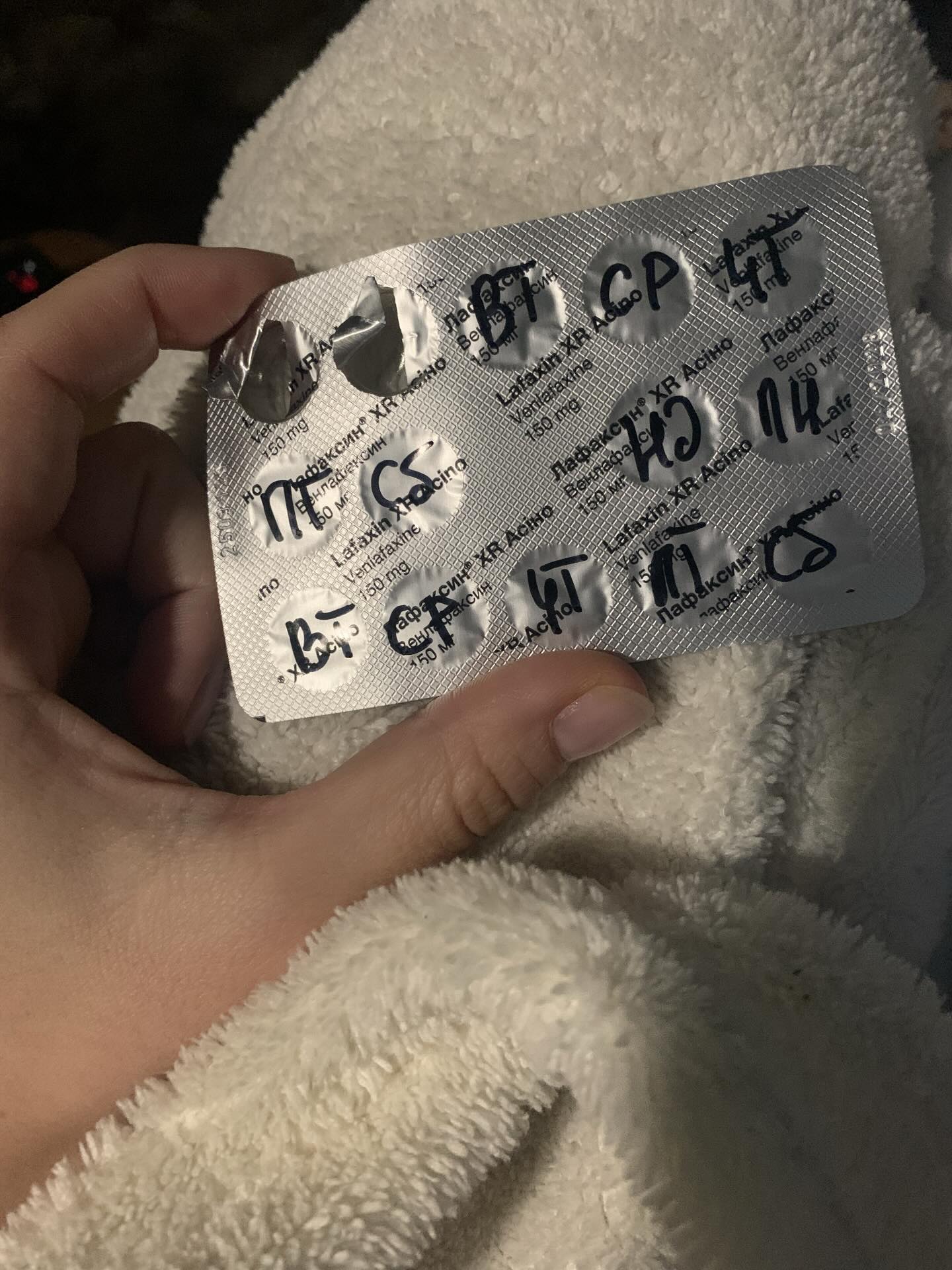 На кадре видно, что девушка решила задачу самым очевидным способом — прямо на пластинке с лекарством она подписала дни недели над каждой таблеткой.