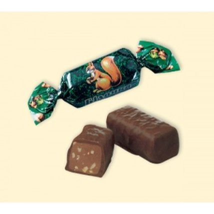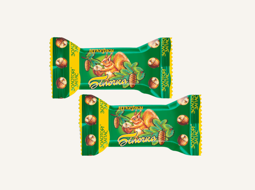"Белочка" – это шоколадные конфеты с пралине и дробленым фундуком, покрытые шоколадной глазурью. Обязательный элемент, который делает их узнаваемыми – стилизованная белка с орехом в лапках на обертке. За всю историю существования появилось несколько цветовых вариантов дизайна фантика, но образ белки оставался неизменным.