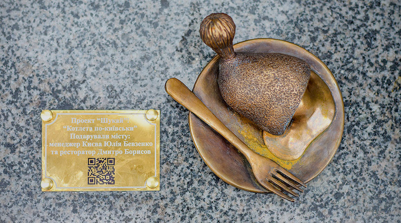 Минискульптура "Котлета по-киевски" установлена в сквере Городецкого возле ресторана Chicken Kyiv (ул. Крещатик, 15/4) в рамках проекта "Шукай". Скульптор Сергей Галенко.