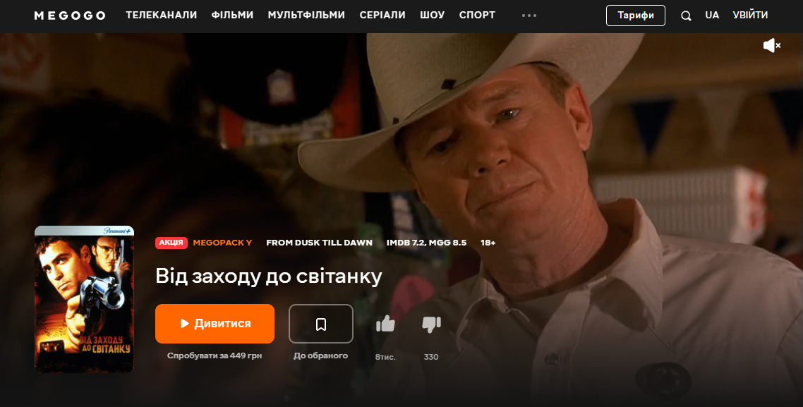 На сервисе MEGOGO, в том числе доступна украинская дорожка озвучки. А если знание английского позволит вам смотреть фильм в оригинале, ищите "От заката до рассвета" на Apple TV/Amazon.