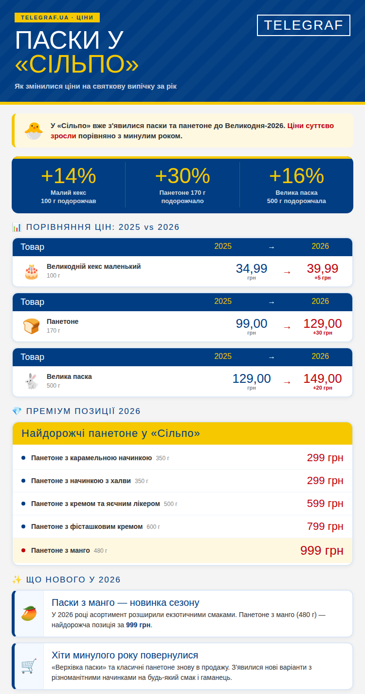 Так, если в прошлом году маленький пасхальный кекс весом 100 г стоил 34,99 грн, то в этом году даже самые простые варианты стоят от 39,99 грн. Более крупные паски и панеттоне демонстрируют еще более заметное подорожание: например, вариант панеттоне, который в 2025 году стоил в пределах 99,0 грн (170 граммов), теперь оценивается в 129 грн (170 граммов) и более в зависимости от начинки и веса.