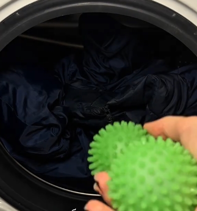 Женщина советует вывернуть пуховик на внутреннюю сторону и застегнуть все замки перед стиркой. Чтобы пух оставался рыхлым, в барабан стиральной машины следует положить два-три чистых теннисных или специальных мячика – они помогают распушить пух во время стирки.