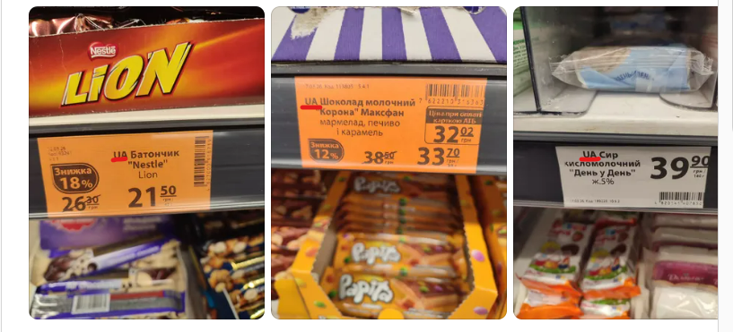 Девушка объяснила, что ценники товаров, доступные для расчета по программе "Национальный кэшбек", имеют специальную отметку — UA. Она размещена перед названием товаров. Она добавила несколько фотографий для примера.