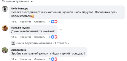 По ее словам, в прошлые сезоны ни Грицик, ни Одарка, которые строили гнездо, не были столь активными и ловкими. За три дня незнакомец изменил гнездо так, что его трудно узнать.