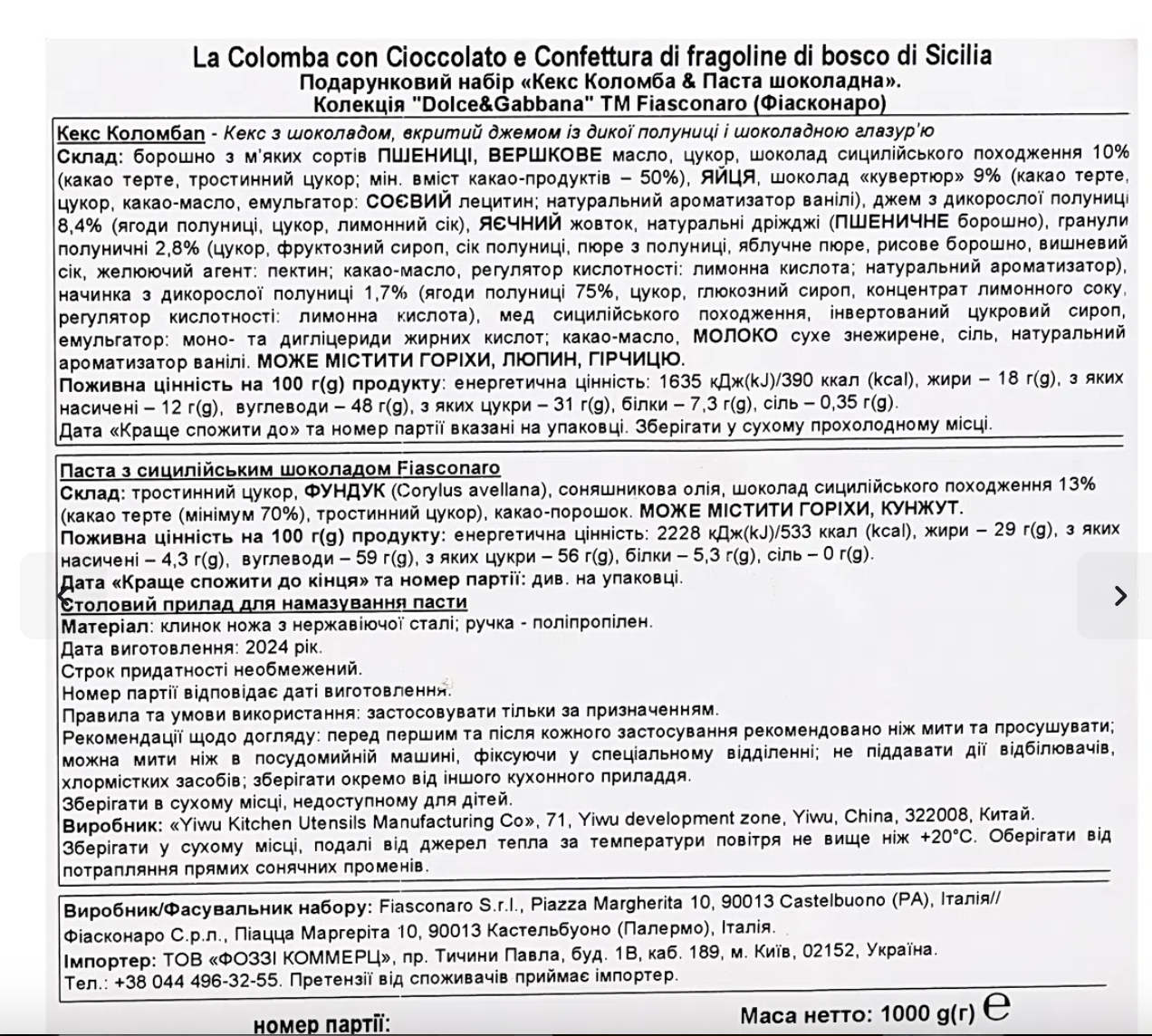 Состав паски Fiasconaro Colomba Dolce&Gabbana
