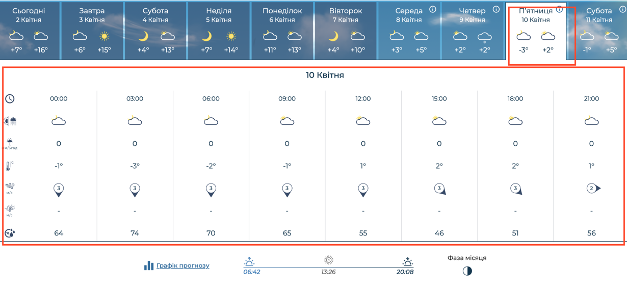 В пятницу, 10 апреля, морозы станут еще заметнее. В ночные и утренние часы температура воздуха упадет до -3°C. Днем небо будет облачным с прояснениями, а воздух прогреется только до мизерных +2°C.