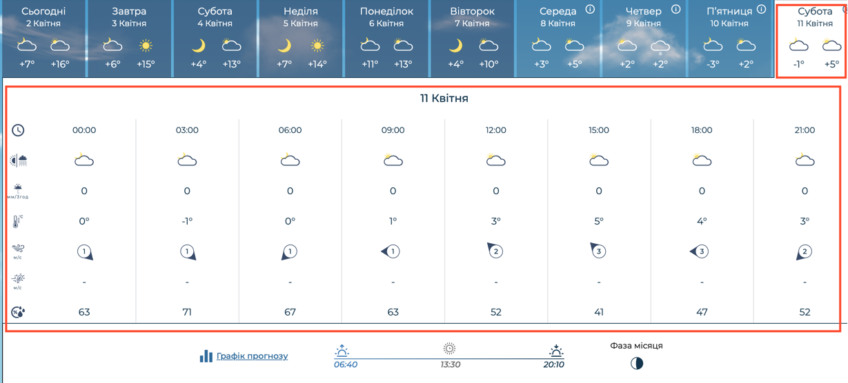Предпраздничная суббота, 11 апреля, также не порадует теплом. Ночная температура будет держаться на уровне -1°C, а днем солнце едва прогреет город до +5°C. В течение всей первой половины дня будет сохраняться сплошная облачность, поэтому жителям Нововолынска стоит позаботиться о теплой одежде заранее.