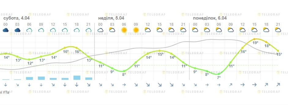 На следующий день, 5 апреля, предполагается облачность, но местами будет выглядывать солнышко. Температура снизится ночью до +8…+9 °C, днем поднимется до +14…+15 °C. Осадки маловероятны.