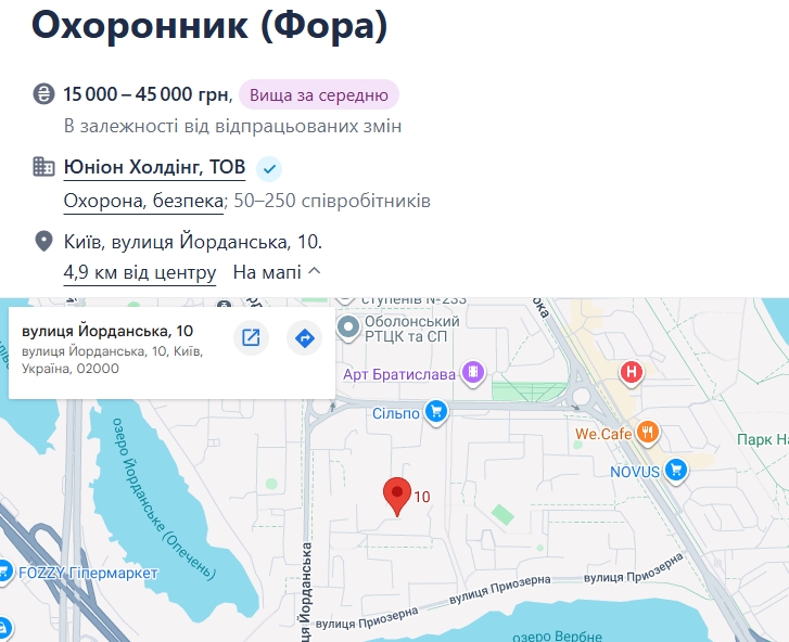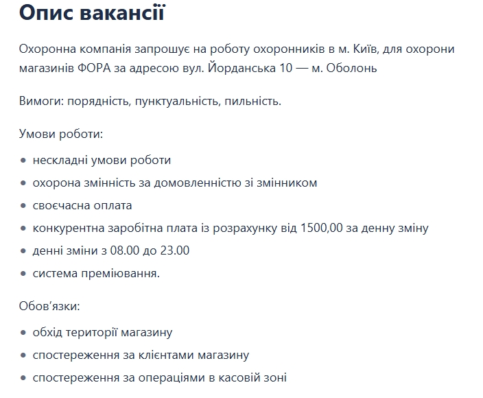"Охранная компания приглашает на работу охранников в г. Киев, для охраны магазина ФОРА по адресу ул. Иорданская 10 — г. Оболонь. Требования: порядочность, пунктуальность, бдительность", — говорится в сообщении.