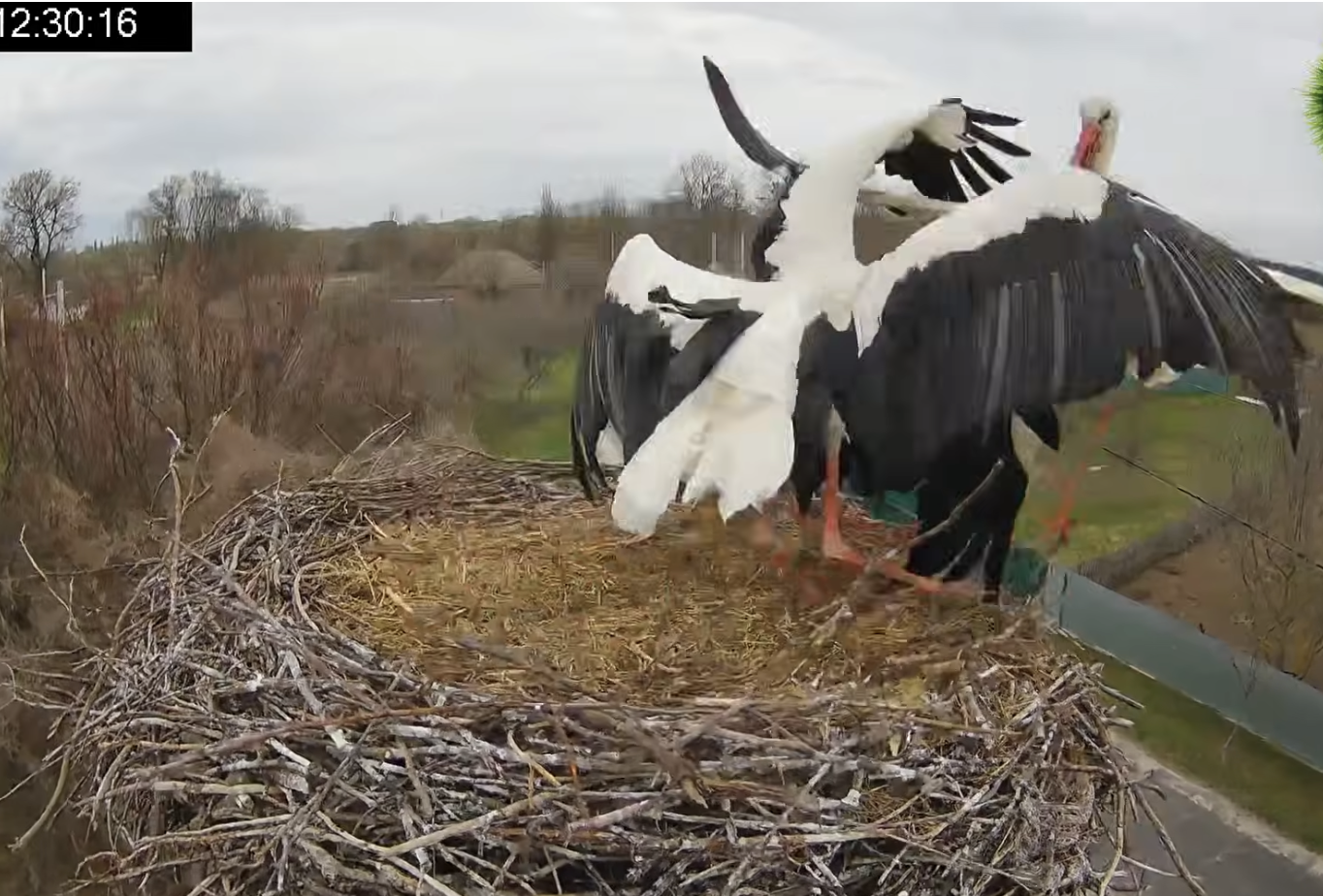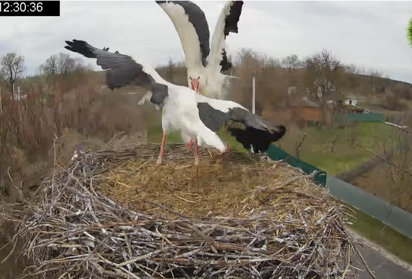 При этом самке также перепадало во время драки, она постоянно улетала и возвращалась. После всего 3 минут драки гость сдался и улетел, а вот самец, отвоевавший гнездо, скорее всего Гриць, получил ранение в грудь. На белых перьях видны следы крови.